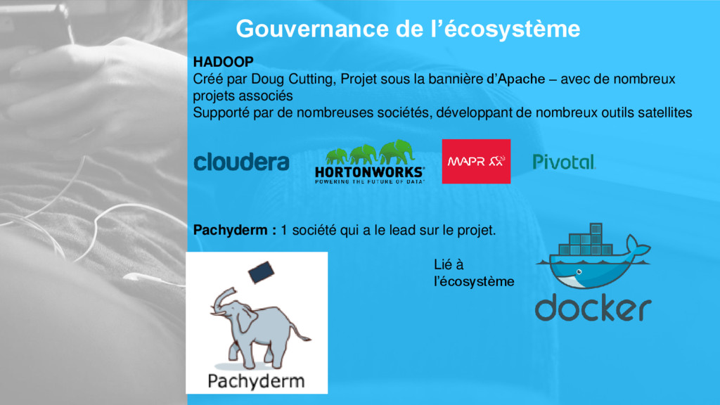 la bannière d’Apache – avec de nombreux projets associés Supporté par de nombreuses sociétés, développant de nombreux outils satellites Pachyderm : 1 société qui a le lead sur le projet. Lié à l’écosystème