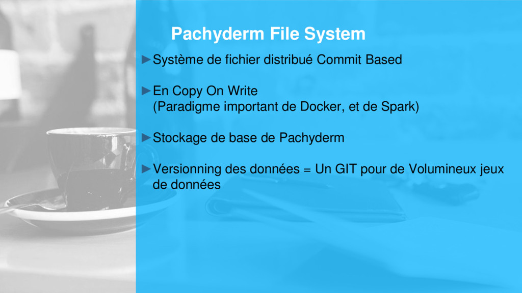Copy On Write (Paradigme important de Docker, et de Spark) ►Stockage de base de Pachyderm ►Versionning des données = Un GIT pour de Volumineux jeux de données