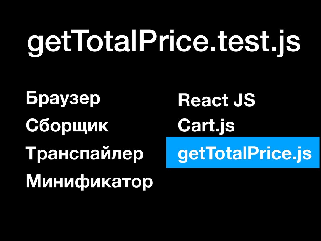 Браузер Сборщик Транспайлер Минификатор React JS Cart.js getTotalPrice.js getTotalPrice.test.js