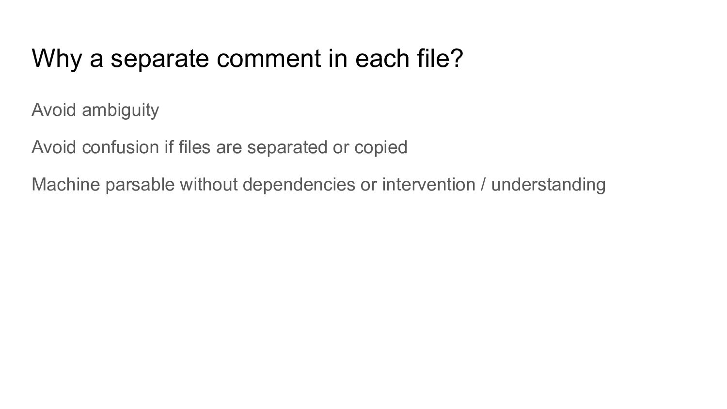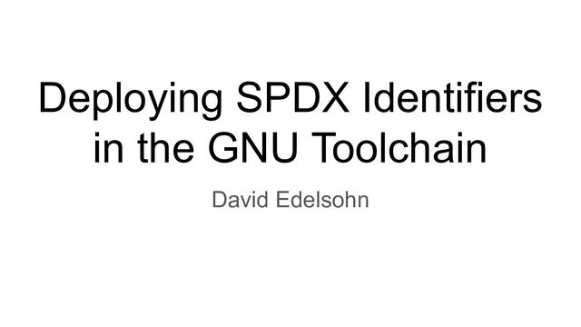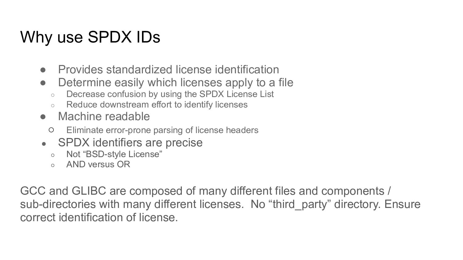 Determine easily which licenses apply to a file ◦ Decrease confusion by using the SPDX License List ◦ Reduce downstream effort to identify licenses • Machine readable ◦ Eliminate error-prone parsing of license headers • SPDX identifiers are precise ◦ Not “BSD-style License” ◦ AND versus OR GCC and GLIBC are composed of many different files and components / sub-directories with many different licenses. No “third_party” directory. Ensure correct identification of license.