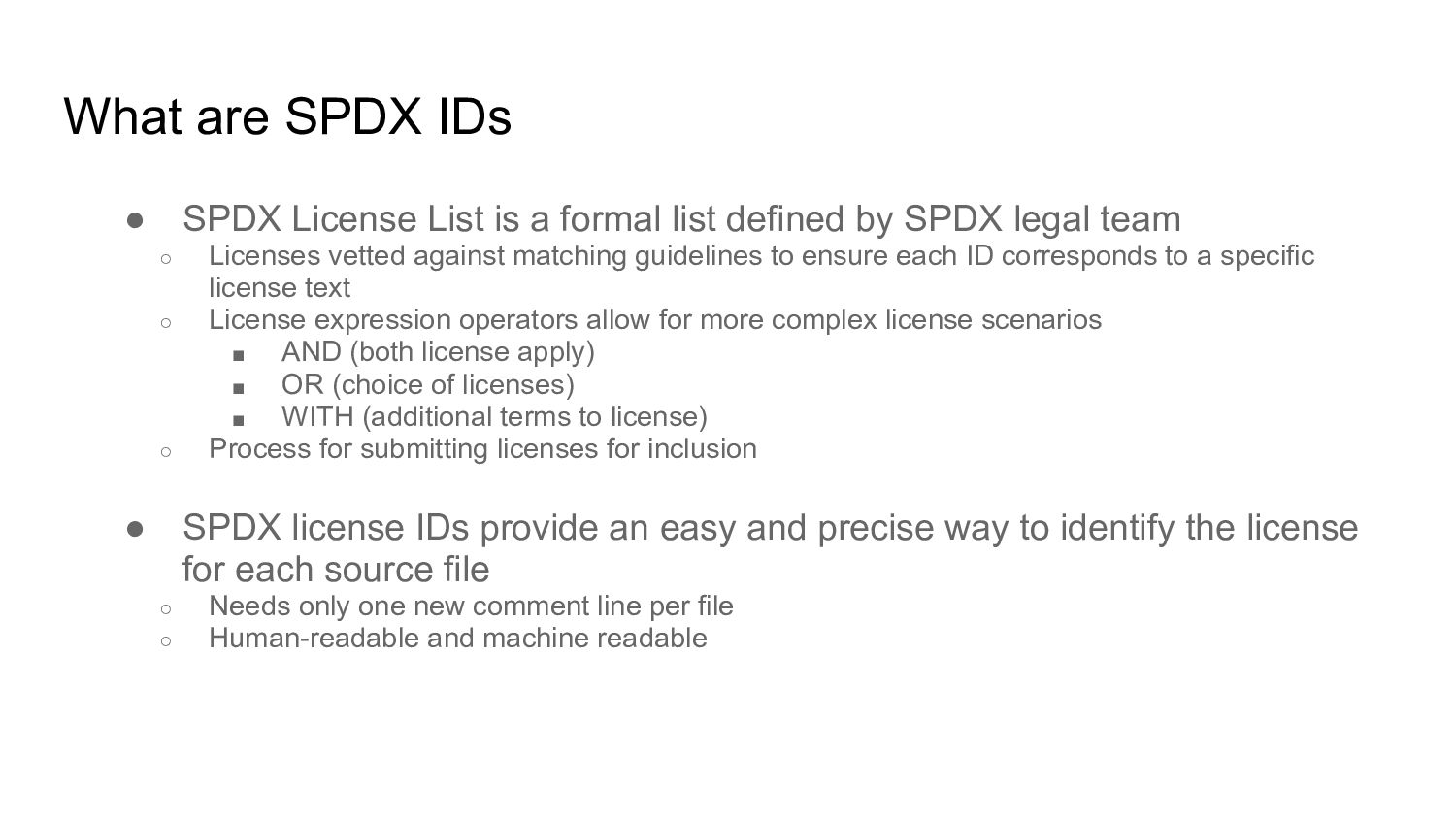 formal list defined by SPDX legal team ◦ Licenses vetted against matching guidelines to ensure each ID corresponds to a specific license text ◦ License expression operators allow for more complex license scenarios ▪ AND (both license apply) ▪ OR (choice of licenses) ▪ WITH (additional terms to license) ◦ Process for submitting licenses for inclusion • SPDX license IDs provide an easy and precise way to identify the license for each source file ◦ Needs only one new comment line per file ◦ Human-readable and machine readable