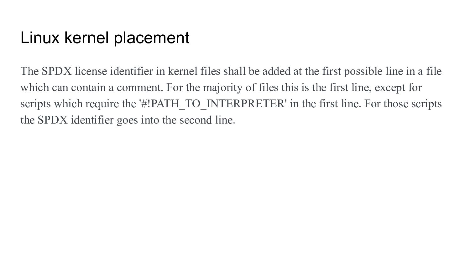 shall be added at the first possible line in a file which can contain a comment. For the majority of files this is the first line, except for scripts which require the '#!PATH_TO_INTERPRETER' in the first line. For those scripts the SPDX identifier goes into the second line.