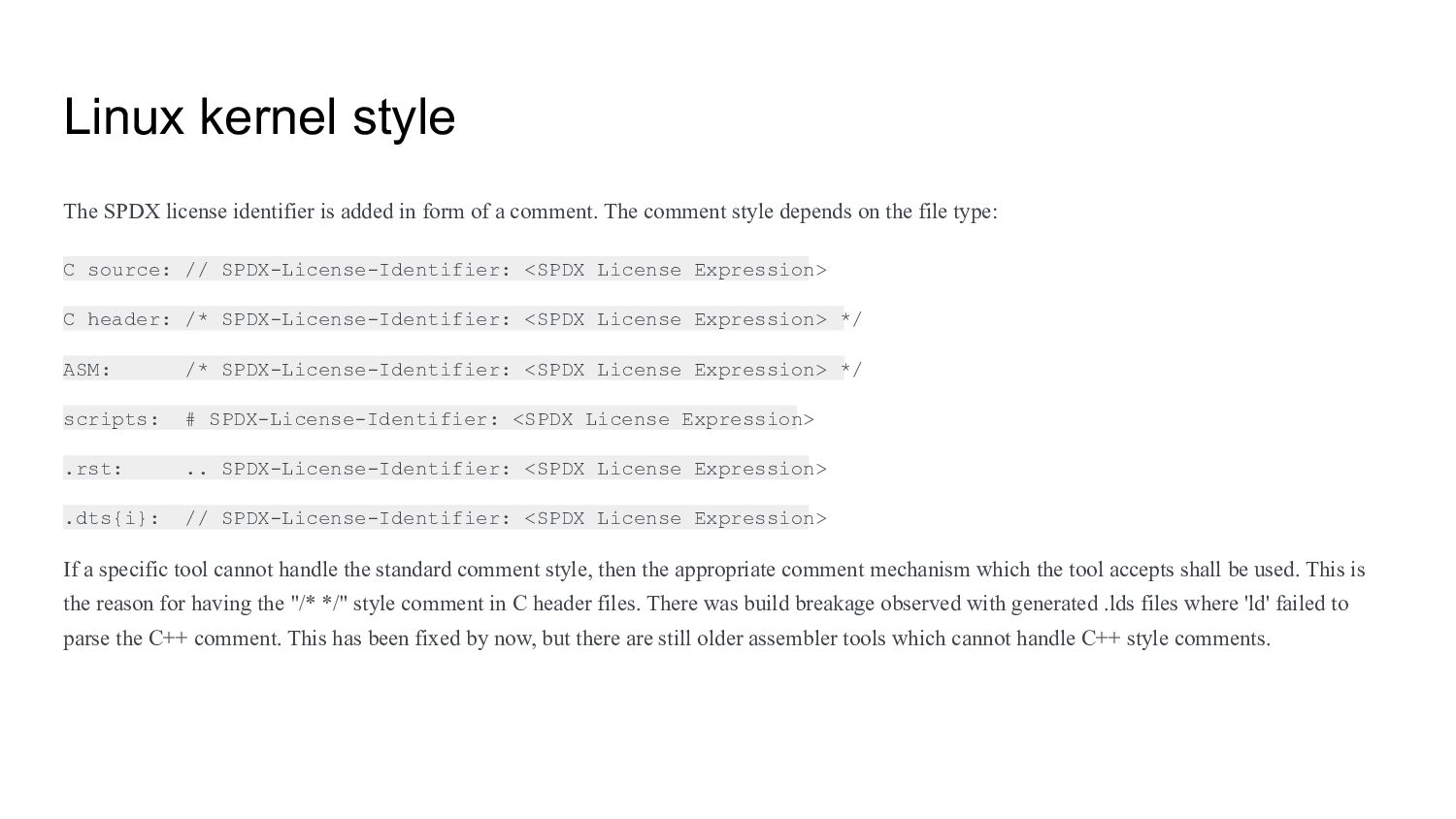 form of a comment. The comment style depends on the file type: C source: // SPDX-License-Identifier: <SPDX License Expression> C header: /* SPDX-License-Identifier: <SPDX License Expression> */ ASM: /* SPDX-License-Identifier: <SPDX License Expression> */ scripts: # SPDX-License-Identifier: <SPDX License Expression> .rst: .. SPDX-License-Identifier: <SPDX License Expression> .dts{i}: // SPDX-License-Identifier: <SPDX License Expression> If a specific tool cannot handle the standard comment style, then the appropriate comment mechanism which the tool accepts shall be used. This is the reason for having the "/* */" style comment in C header files. There was build breakage observed with generated .lds files where 'ld' failed to parse the C++ comment. This has been fixed by now, but there are still older assembler tools which cannot handle C++ style comments.