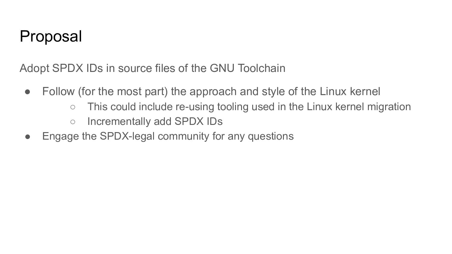 Toolchain • Follow (for the most part) the approach and style of the Linux kernel ◦ This could include re-using tooling used in the Linux kernel migration ◦ Incrementally add SPDX IDs • Engage the SPDX-legal community for any questions