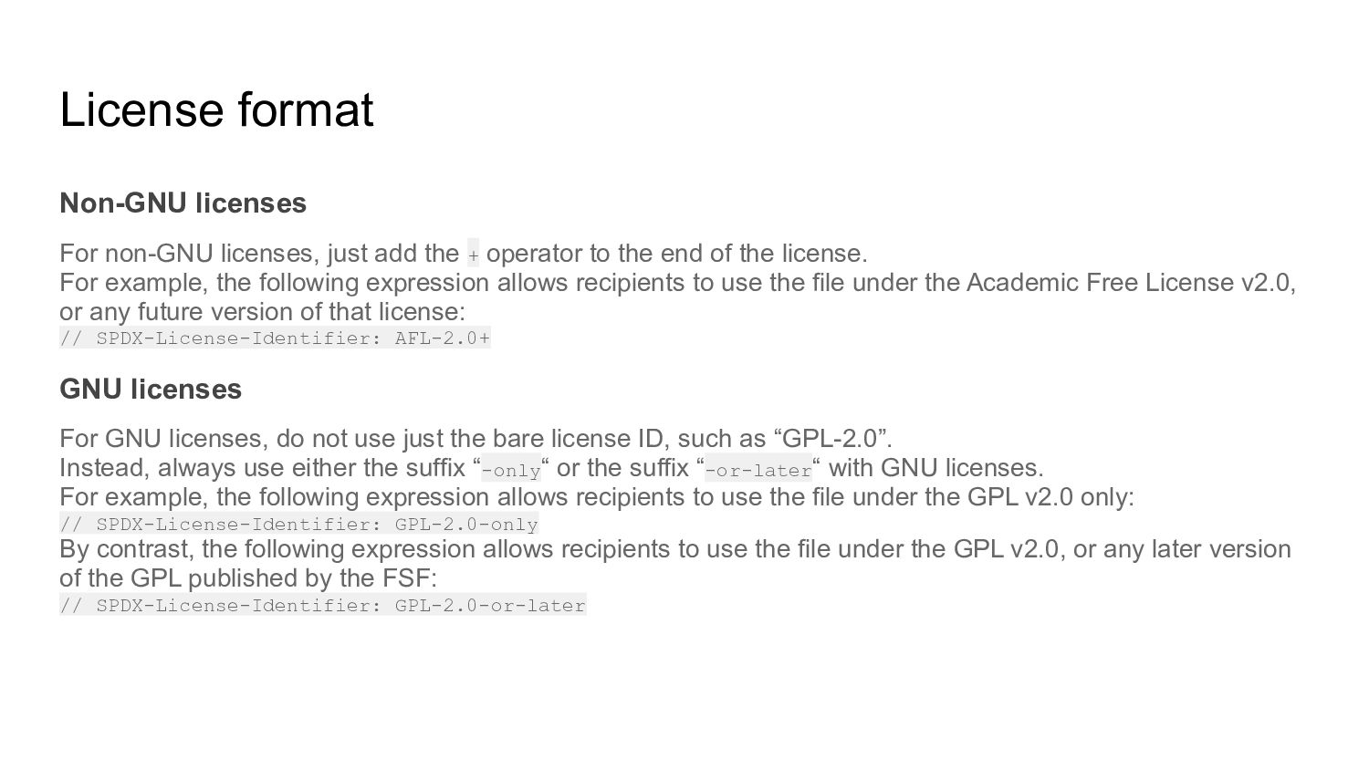 + operator to the end of the license. For example, the following expression allows recipients to use the file under the Academic Free License v2.0, or any future version of that license: // SPDX-License-Identifier: AFL-2.0+ GNU licenses For GNU licenses, do not use just the bare license ID, such as “GPL-2.0”. Instead, always use either the suffix “-only“ or the suffix “-or-later“ with GNU licenses. For example, the following expression allows recipients to use the file under the GPL v2.0 only: // SPDX-License-Identifier: GPL-2.0-only By contrast, the following expression allows recipients to use the file under the GPL v2.0, or any later version of the GPL published by the FSF: // SPDX-License-Identifier: GPL-2.0-or-later