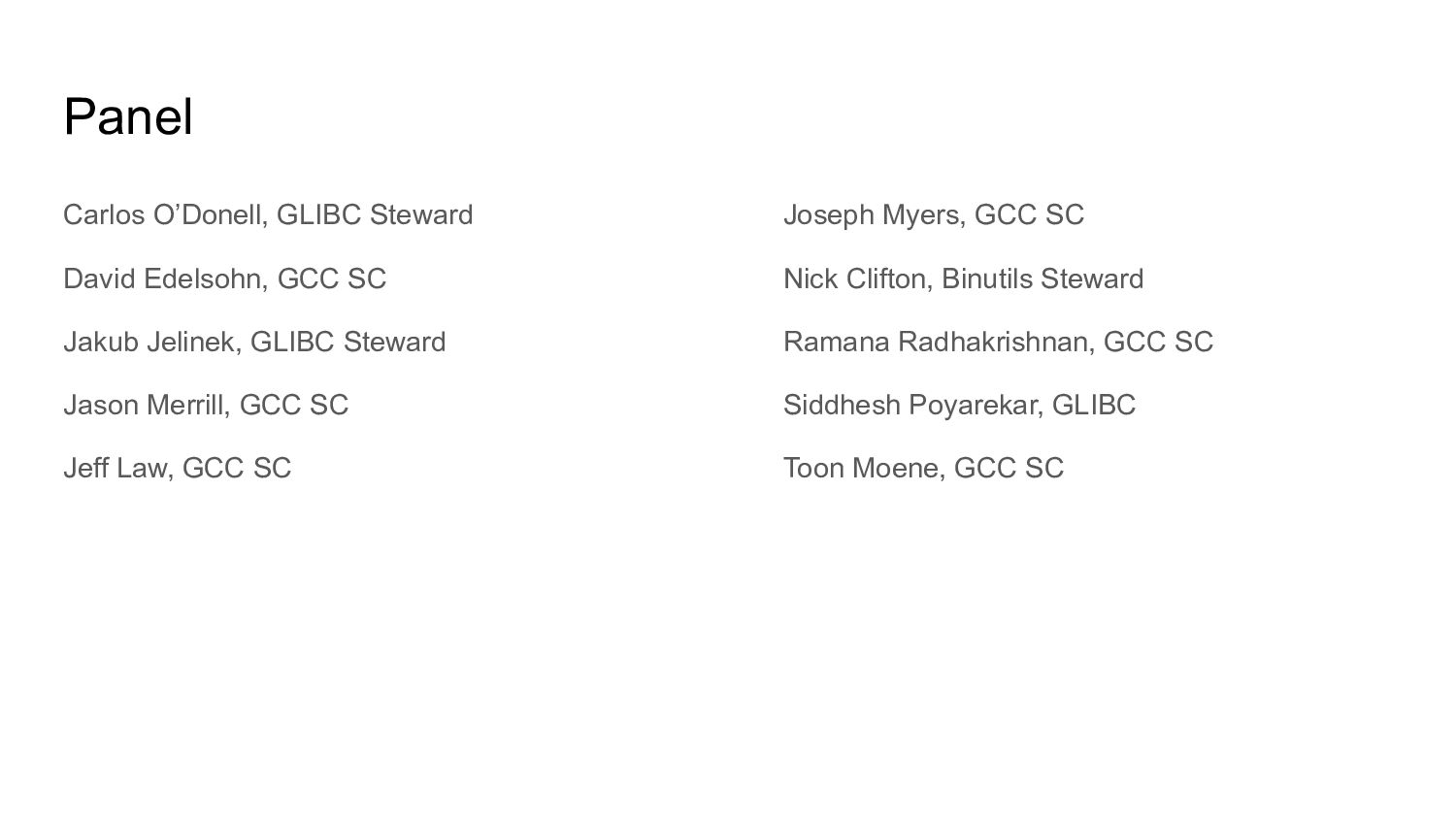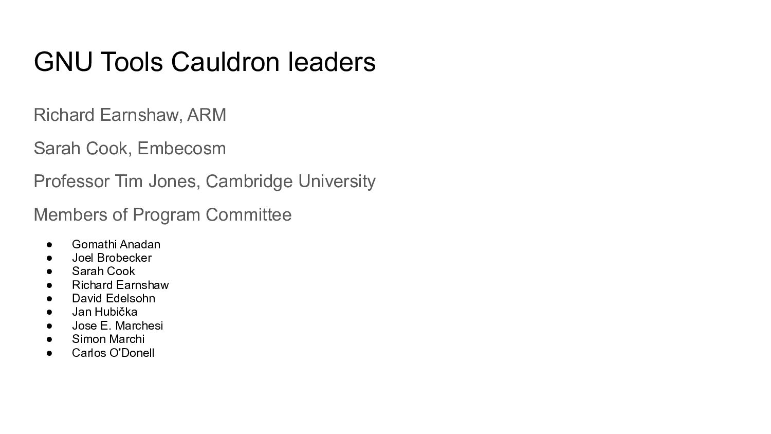 Professor Tim Jones, Cambridge University Members of Program Committee • Gomathi Anadan • Joel Brobecker • Sarah Cook • Richard Earnshaw • David Edelsohn • Jan Hubička • Jose E. Marchesi • Simon Marchi • Carlos O'Donell