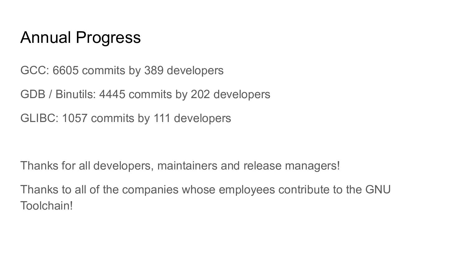 Binutils: 4445 commits by 202 developers GLIBC: 1057 commits by 111 developers Thanks for all developers, maintainers and release managers! Thanks to all of the companies whose employees contribute to the GNU Toolchain!