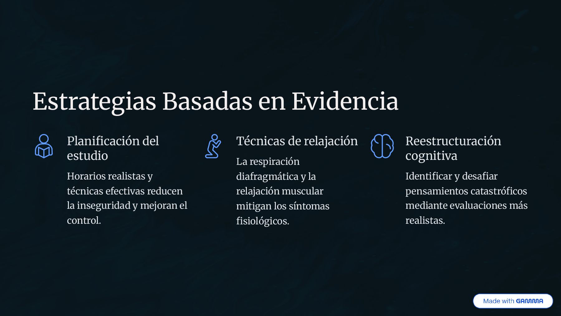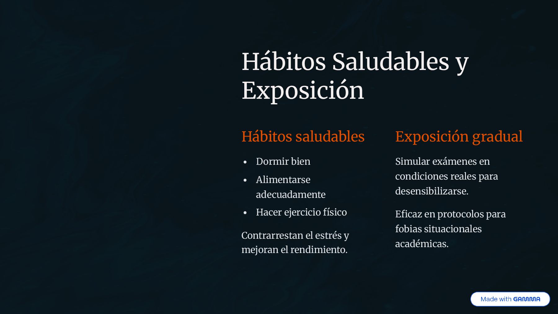 Hacer ejercicio físico Contrarrestan el estrés y mejoran el rendimiento. Exposición gradual Simular exámenes en condiciones reales para desensibilizarse. Eficaz en protocolos para fobias situacionales académicas.