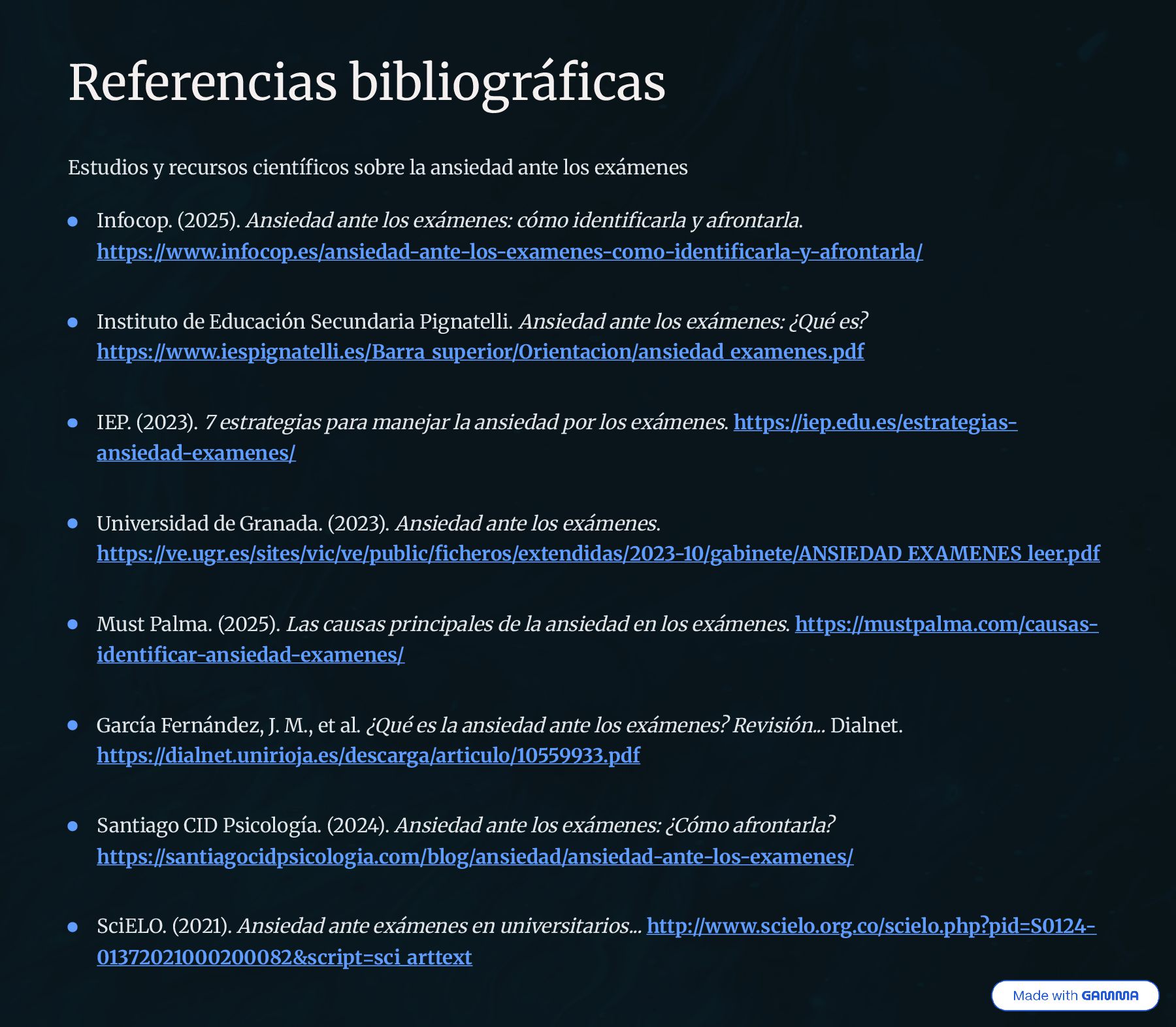 los exámenes Infocop. (2025). Ansiedad ante los exámenes: cómo identificarla y afrontarla. hččéÿ://ŁŁŁ.u±f¿c¿é.eÿ/a±ÿuedad-a±če-¿ÿ-eŊa«e±eÿ-c¿«¿-ude±čufucaña-ō-afñ¿±čaña/ Instituto de Educación Secundaria Pignatelli. Ansiedad ante los exámenes: ¿Qué es? hččéÿ://ŁŁŁ.ueÿéug±ačeu.eÿ/Bañña_ÿěéeñu¿ñ/Oñue±čacu¿±/a±ÿuedad_eŊa«e±eÿ.édf IEP. (2023). 7 estrategias para manejar la ansiedad por los exámenes. hččéÿ://ueé.edě.eÿ/eÿčñačeguaÿ- a±ÿuedad-eŊa«e±eÿ/ Universidad de Granada. (2023). Ansiedad ante los exámenes. hččéÿ://ļe.ěgñ.eÿ/ÿučeÿ/ļuc/ļe/éěbuc/fucheñ¿ÿ/eŊče±dudaÿ/2023-10/gabu±eče/ANSIEDAD_EXAMENES_eeñ.édf Must Palma. (2025). Las causas principales de la ansiedad en los exámenes. hččéÿ://«ěÿčéa«a.c¿«/caěÿaÿ- ude±čufucañ-a±ÿuedad-eŊa«e±eÿ/ García Fernández, J. M., et al. ¿Qué es la ansiedad ante los exámenes? Revisión... Dialnet. hččéÿ://dua±eč.ě±uñu¿a.eÿ/deÿcañga/añčucě¿/10559933.édf Santiago CID Psicología. (2024). Ansiedad ante los exámenes: ¿Cómo afrontarla? hččéÿ://ÿa±čuag¿cudéÿuc¿¿gua.c¿«/b¿g/a±ÿuedad/a±ÿuedad-a±če-¿ÿ-eŊa«e±eÿ/ SciELO. (2021). Ansiedad ante exámenes en universitarios... hččé://ŁŁŁ.ÿcue¿.¿ñg.c¿/ÿcue¿.éhé?éud=S0124- 01372021000200082&ÿcñuéč=ÿcu_añččeŊč