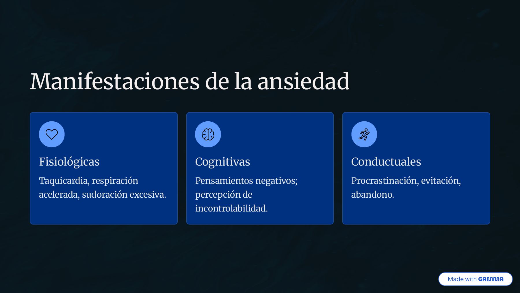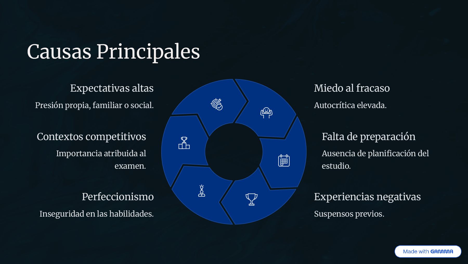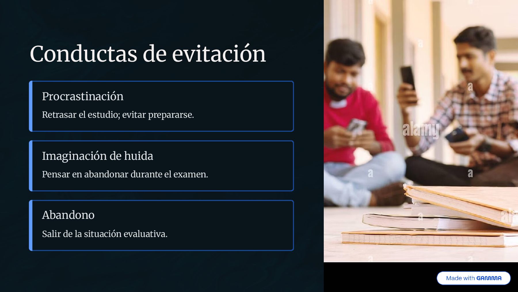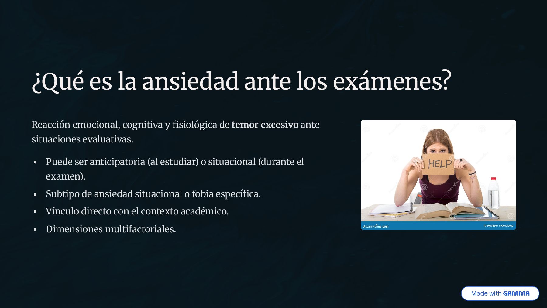 y fisiológica de temor excesivo ante situaciones evaluativas. Puede ser anticipatoria (al estudiar) o situacional (durante el examen). Subtipo de ansiedad situacional o fobia específica. Vínculo directo con el contexto académico. Dimensiones multifactoriales.