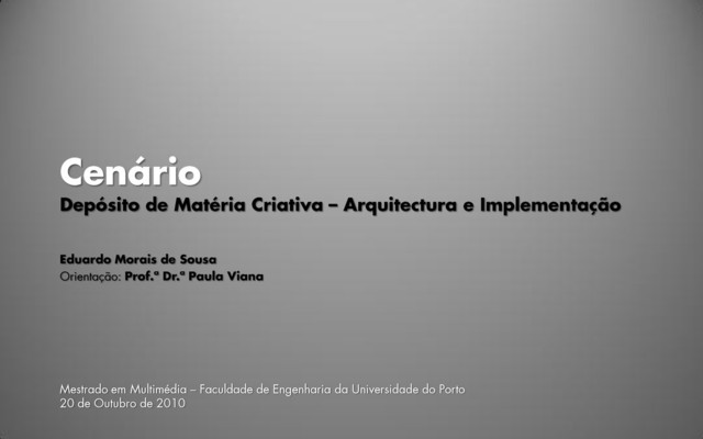 Apresentação utilizada na defesa da minha dissertação 'Cenário, Depósito de Matéria Criativa - Arquitectura e Implementação', para obtenção do Mestrado em Multimédia da Faculdade de Engenharia da Universidade do Porto (FEUP).