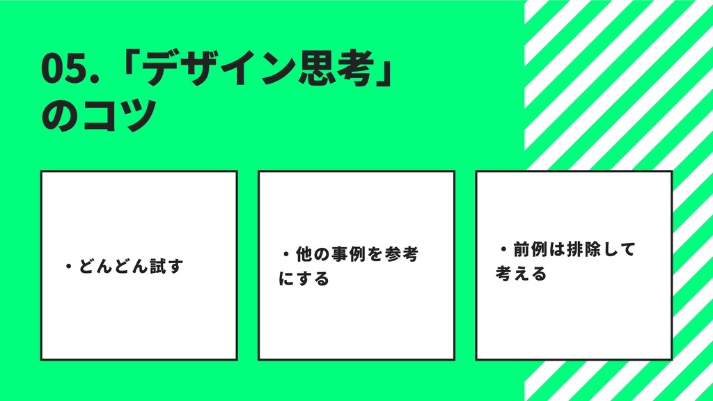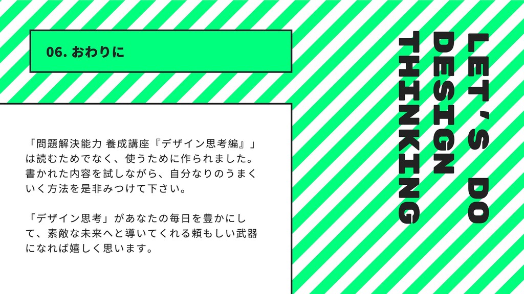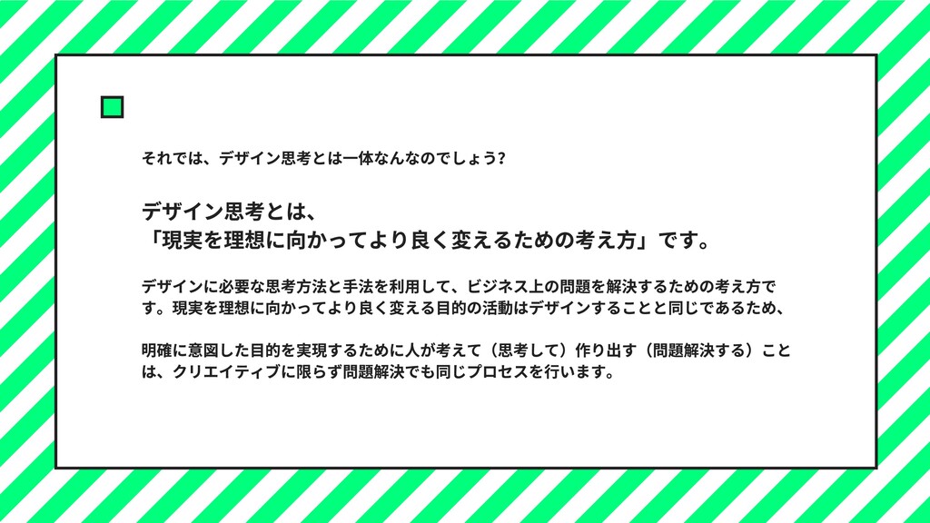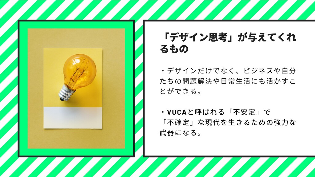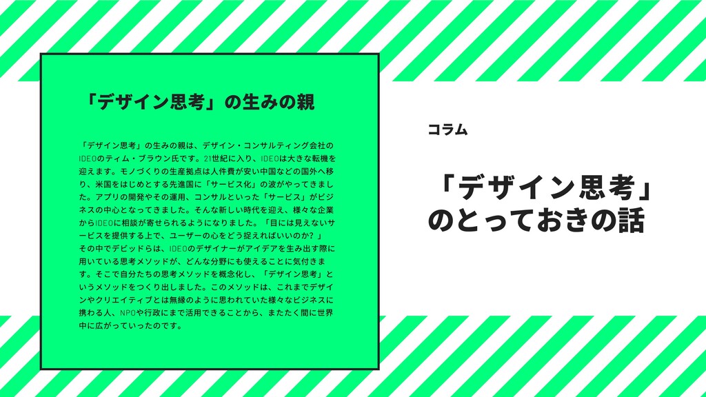 のティム・ブラウン⽒です。21 世紀に⼊り、IDEO は⼤きな転機を 迎えます。モノづくりの⽣産拠点は⼈件費が安い中国などの国外へ移 り、⽶国をはじめとする先進国に「サービス化」の波がやってきまし た。アプリの開発やその運⽤、コンサルといった「サービス」がビジ ネスの中⼼となってきました。そんな新しい時代を迎え、様々な企業 からIDEO に相談が寄せられるようになりました。「⽬には⾒えないサ ービスを提供する上で、ユーザーの⼼をどう捉えればいいのか?」 その中でデビッドらは、IDEO のデザイナーがアイデアを⽣み出す際に ⽤いている思考メソッドが、どんな分野にも使えることに気付きま す。そこで⾃分たちの思考メソッドを概念化し、「デザイン思考」と いうメソッドをつくり出しました。このメソッドは、これまでデザイ ンやクリエイティブとは無縁のように思われていた様々なビジネスに 携わる⼈、NPO や⾏政にまで活⽤できることから、またたく間に世界 中に広がっていったのです。