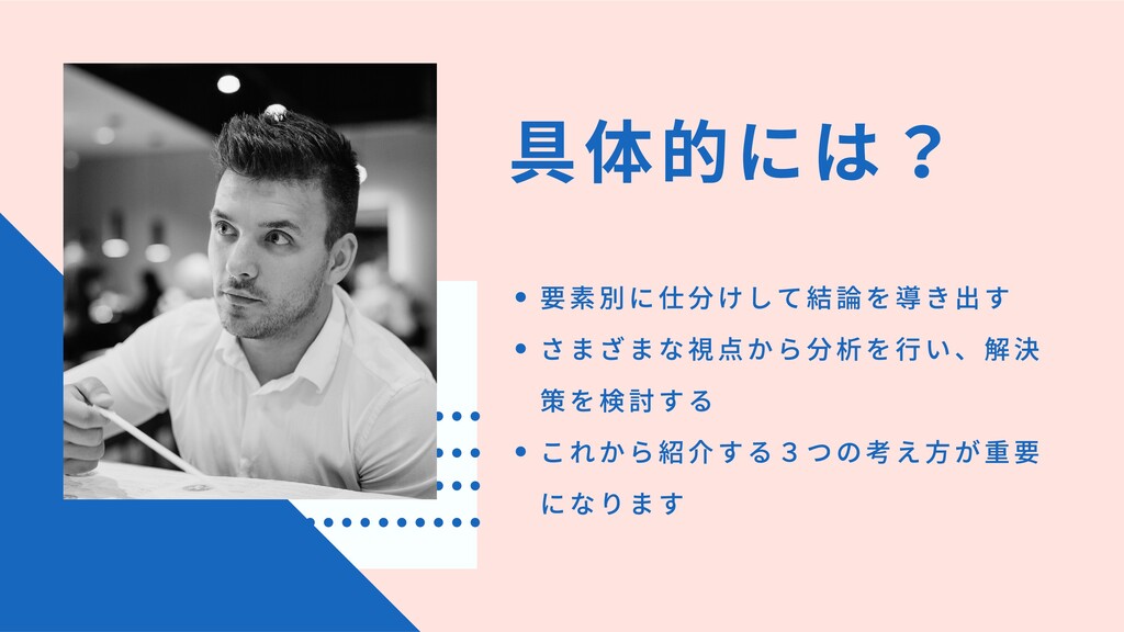 体的には 要素別に仕分けして結論を導き出す さまざまな視点から分析を⾏い、解決 策を検討する これから紹介する3つの考え⽅が重要 になります