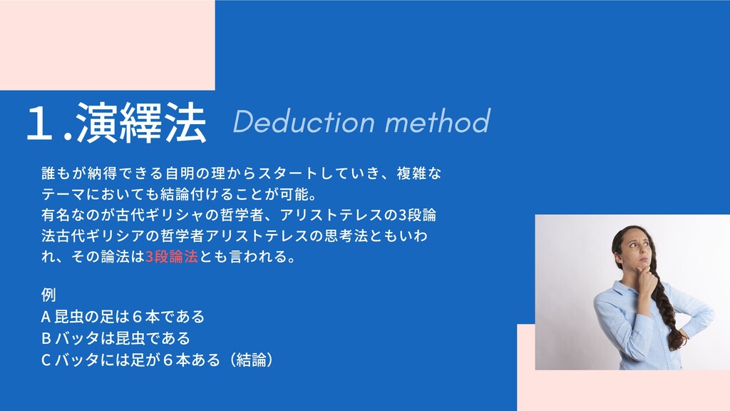 1.演繹法 誰もが納得できる⾃明の理からスタートしていき、複雑な テーマにおいても結論付けることが可能。 有名なのが古代ギリシャの哲学者、アリストテレスの3段論 法古代ギリシアの哲学者アリストテレスの思考法ともいわ れ、その論法は3段論法とも⾔われる。 例 A昆⾍の⾜は6本である Bバッタは昆⾍である Cバッタには⾜が6本ある(結論)