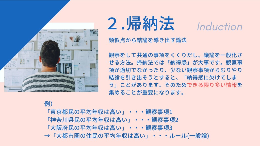 2.帰納法 類似点から結論を導き出す論法 観察をして共通の事項をくくりだし、議論を⼀般化さ せる⽅法。帰納法では「納得感」が⼤事です。観察事 項が適切でなかったり、少ない観察事項からむりやり 結論を引き出そうとすると、「納得感に⽋けてしま う」ことがあります。そのためできる限り多い情報を 集めることが重要になります。 例)