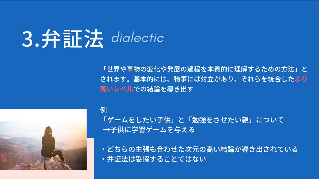 3.弁証法 「世界や事物の変化や発展の過程を本質的に理解するための⽅法」と されます。基本的には、物事には対⽴があり、それらを統合したより ⾼いレベルでの結論を導き出す 例 「ゲームをしたい⼦供」と「勉強をさせたい親」について →⼦供に学習ゲームを与える ・どちらの主張も合わせた次元の⾼い結論が導き出されている ・弁証法は妥協することではない