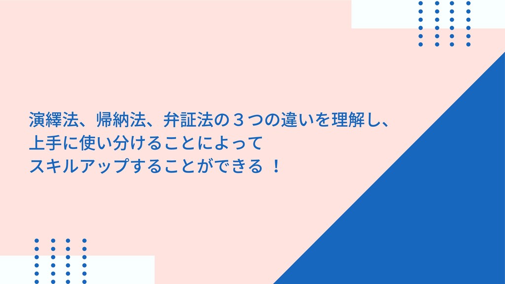 演繹法、帰納法、弁証法の3つの違いを理解し、 上⼿に使い分けることによって スキルアップすることができる!