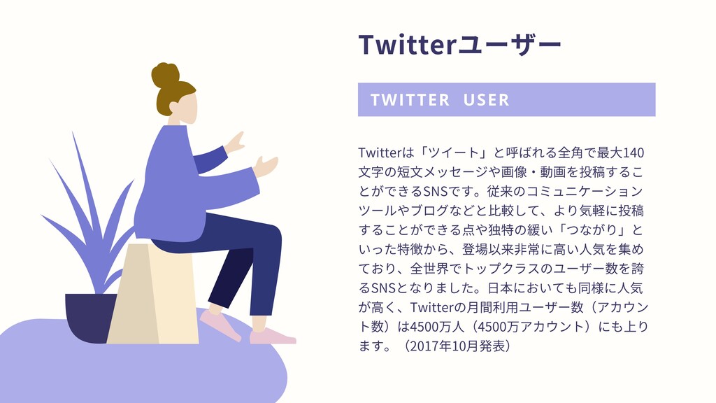 るSNSとなりました。⽇本においても同様に⼈気 が⾼く、Twitterの⽉間利⽤ユーザー数(アカウン ト数)は4500万⼈(4500万アカウント)にも上り ます。(2017年10⽉発表)