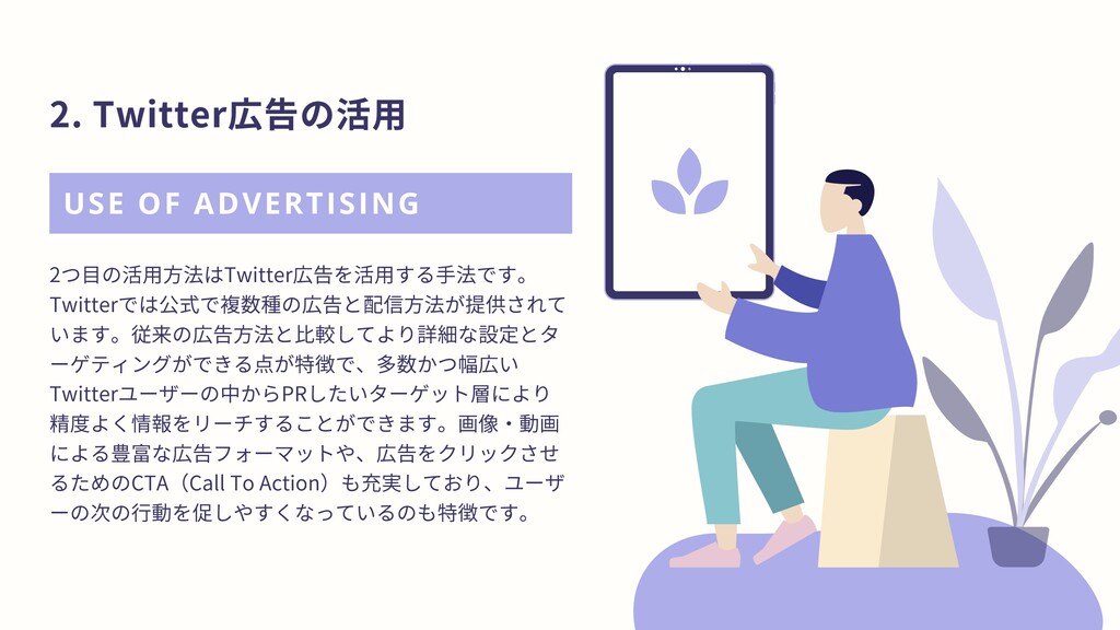 2.Twitter広告の活⽤ USE OF ADVERTISING 2つ⽬の活⽤⽅法はTwitter広告を活⽤する⼿法です。 Twitterでは公式で複数種の広告と配信⽅法が提供されて います。従来の広告⽅法と⽐較してより詳細な設定とタ ーゲティングができる点が特徴で、多数かつ幅広い Twitterユーザーの中からPRしたいターゲット層により 精度よく情報をリーチすることができます。画像・動画