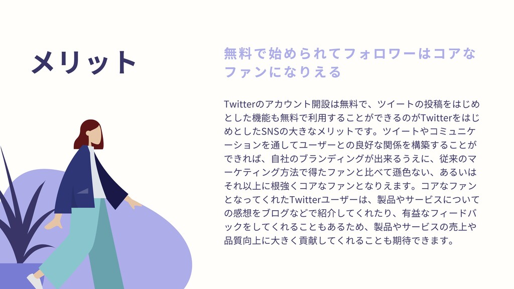 メリット 無料で始められてフォロワーはコアな ファンになりえる Twitterのアカウント開設は無料で、ツイートの投稿をはじめ とした機能も無料で利⽤することができるのがTwitterをはじ めとしたSNSの⼤きなメリットです。ツイートやコミュニケ ーションを通してユーザーとの良好な関係を構築することが できれば、⾃社のブランディングが出来るうえに、従来のマ ーケティング⽅法で得たファンと⽐べて遜⾊ない、あるいは それ以上に根強くコアなファンとなりえます。コアなファン