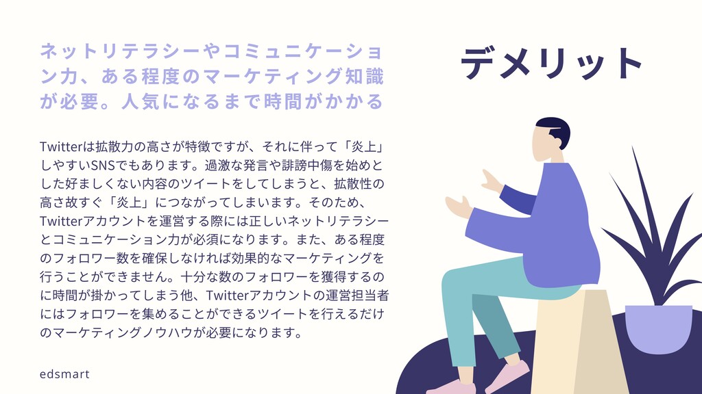 edsmart デメリット ネットリテラシーやコミュニケーショ ン⼒、ある程度のマーケティング知識 が必要。⼈気になるまで時間がかかる Twitterは拡散⼒の⾼さが特徴ですが、それに伴って「炎上」 しやすいSNSでもあります。過激な発⾔や誹謗中傷を始めと した好ましくない内容のツイートをしてしまうと、拡散性の ⾼さ故すぐ「炎上」につながってしまいます。そのため、 Twitterアカウントを運営する際には正しいネットリテラシー