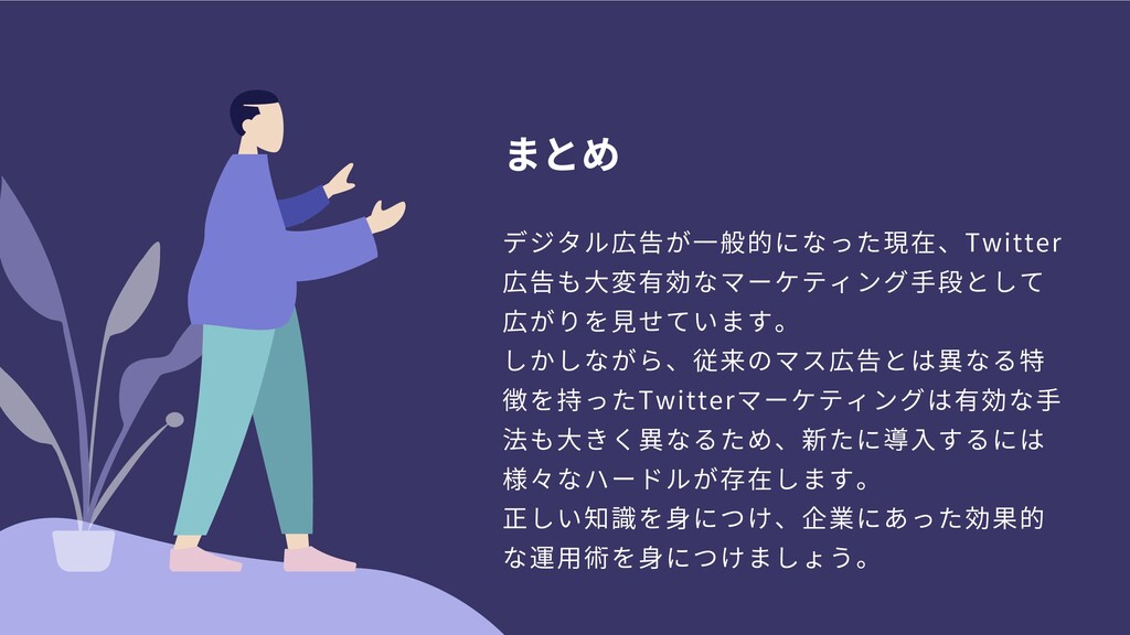 デジタル広告が⼀般的になった現在、Twitter 広告も⼤変有効なマーケティング⼿段として 広がりを⾒せています。 しかしながら、従来のマス広告とは異なる特 徴を持ったTwitterマーケティングは有効な⼿ 法も⼤きく異なるため、新たに導⼊するには 様々なハードルが存在します。 正しい知識を⾝につけ、企業にあった効果的 な運⽤術を⾝につけましょう。 まとめ
