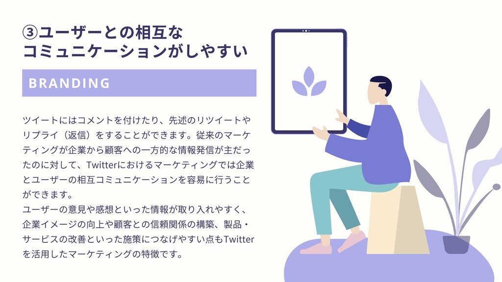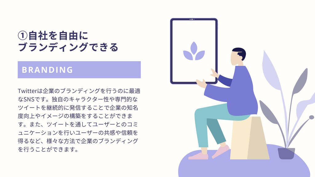 ①⾃社を⾃由に ブランディングできる BRANDING Twitterは企業のブランディングを⾏うのに最適 なSNSです。独⾃のキャラクター性や専⾨的な ツイートを継続的に発信することで企業の知名 度向上やイメージの構築をすることができま す。また、ツイートを通してユーザーとのコミ ュニケーションを⾏いユーザーの共感や信頼を 得るなど、様々な⽅法で企業のブランディング