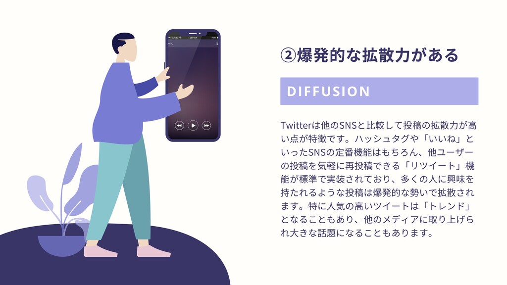 ②爆発的な拡散⼒がある DIFFUSION Twitterは他のSNSと⽐較して投稿の拡散⼒が⾼ い点が特徴です。ハッシュタグや「いいね」と いったSNSの定番機能はもちろん、他ユーザー の投稿を気軽に再投稿できる「リツイート」機 能が標準で実装されており、多くの⼈に興味を 持たれるような投稿は爆発的な勢いで拡散され ます。特に⼈気の⾼いツイートは「トレンド」 となることもあり、他のメディアに取り上げら