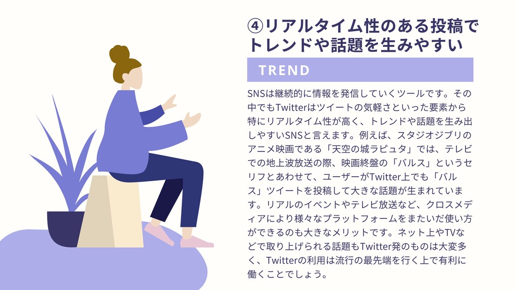 ④リアルタイム性のある投稿で トレンドや話題を⽣みやすい TREND SNSは継続的に情報を発信していくツールです。その 中でもTwitterはツイートの気軽さといった要素から 特にリアルタイム性が⾼く、トレンドや話題を⽣み出 しやすいSNSと⾔えます。例えば、スタジオジブリの アニメ映画である「天空の城ラピュタ」では、テレビ での地上波放送の際、映画終盤の「バルス」というセ リフとあわせて、ユーザーがTwitter上でも「バル