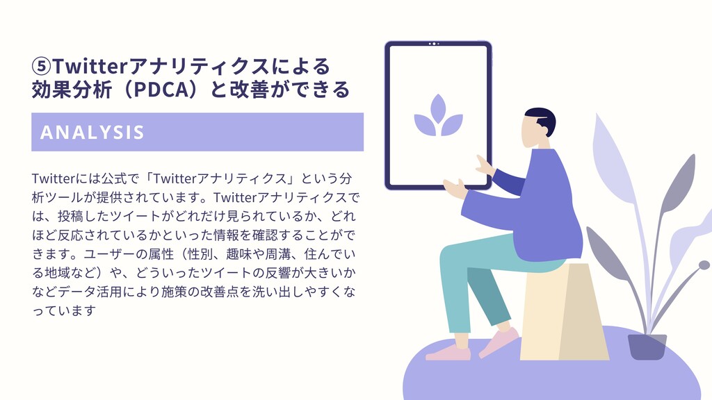 ⑤Twitterアナリティクスによる 効果分析(PDCA)と改善ができる ANALYSIS Twitterには公式で「Twitterアナリティクス」という分 析ツールが提供されています。Twitterアナリティクスで は、投稿したツイートがどれだけ⾒られているか、どれ ほど反応されているかといった情報を確認することがで きます。ユーザーの属性(性別、趣味や周溝、住んでい る地域など)や、どういったツイートの反響が⼤きいか などデータ活⽤により施策の改善点を洗い出しやすくな