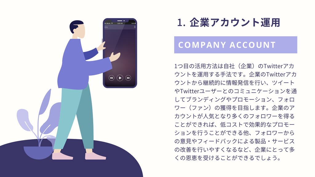企業アカウント運⽤ 1. COMPANY ACCOUNT 1つ⽬の活⽤⽅法は⾃社(企業)のTwitterアカ ウントを運⽤する⼿法です。企業のTwitterアカ ウントから継続的に情報発信を⾏い、ツイート やTwitterユーザーとのコミュニケーションを通 してブランディングやプロモーション、フォロ ワー(ファン)の獲得を⽬指します。企業のア