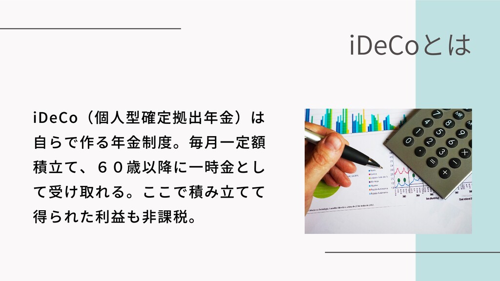 iDeCoとは iDeCo(個⼈型確定拠出年⾦)は ⾃らで作る年⾦制度。毎⽉⼀定額 積⽴て、60歳以降に⼀時⾦とし て受け取れる。ここで積み⽴てて 得られた利益も⾮課税。