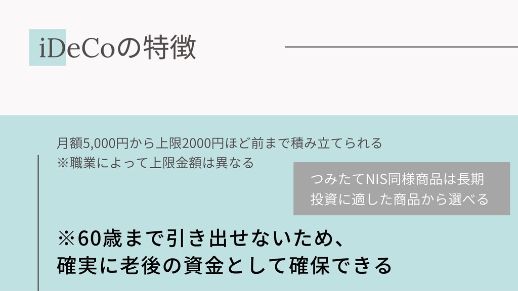 iDeCo の 徴 ⽉額5,000円から上限2000円ほど前まで積み⽴てられる ※職業によって上限⾦額は異なる つみたてNIS同様商品は⻑期 投資に適した商品から選べる ※60歳まで引き出せないため、 確実に⽼後の資⾦として確保できる
