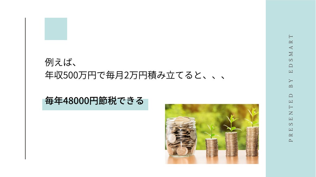 例えば、 年収500万円で毎⽉2万円積み⽴てると、、、 毎年48000円節税できる P R E S E N