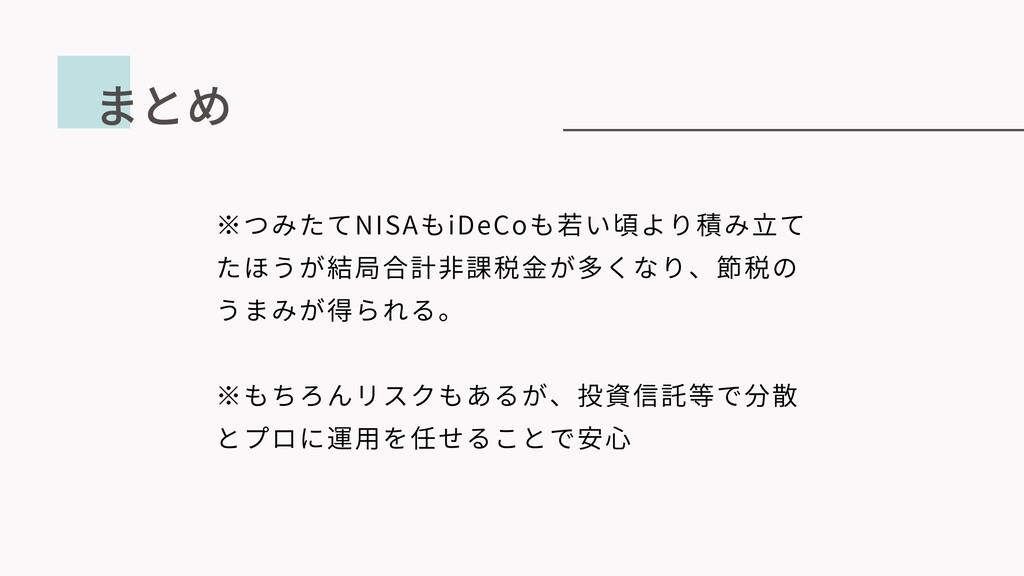 まとめ ※つみたてNISAもiDeCoも若い頃より積み⽴て たほうが結局合計⾮課税⾦が多くなり、節税の うまみが得られる。 ※もちろんリスクもあるが、投資信託等で分散 とプロに運⽤を任せることで安⼼