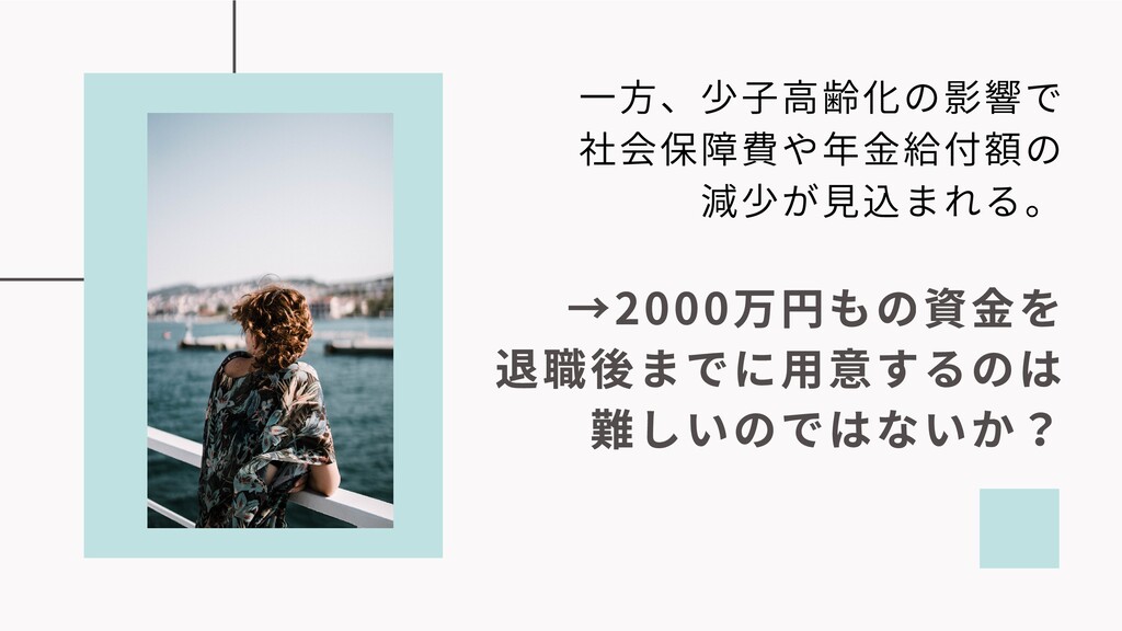 →2000万円もの資⾦を 退職後までに⽤意するのは 難しいのではないか? ⼀⽅、少⼦⾼齢化の影響で 社会保障費や年⾦給付額の 減少が⾒込まれる。