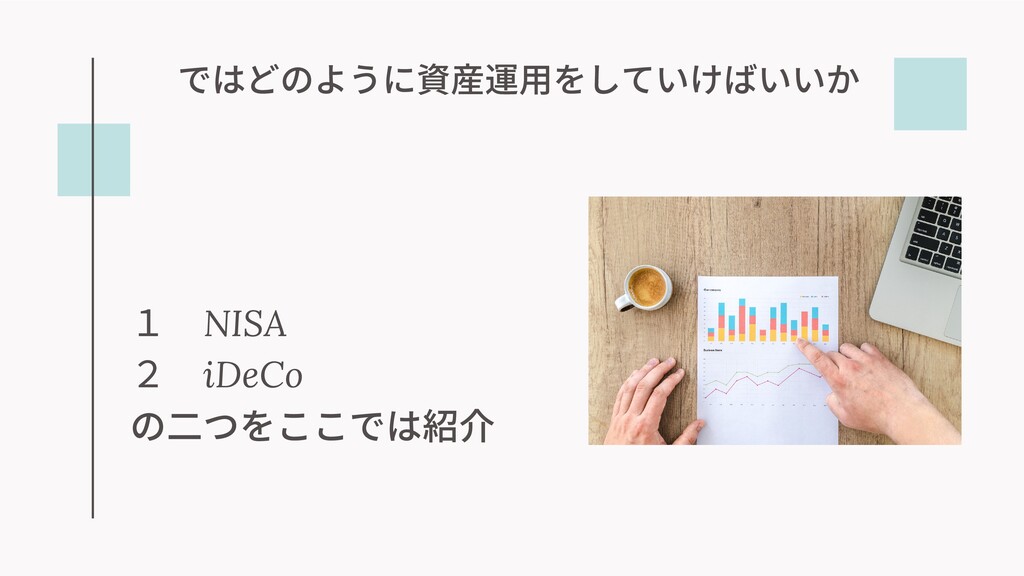 ではどのように資産運⽤をしていけばいいか 1 NISA 2 iDeCo の⼆つをここでは紹介