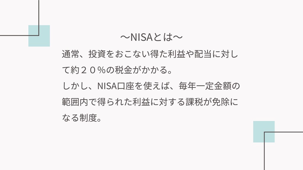 〜NISAとは〜 通常、投資をおこない得た利益や配当に対し て約20%の税⾦がかかる。 しかし、NISA⼝座を使えば、毎年⼀定⾦額の 範囲内で得られた利益に対する課税が免除に なる制度。