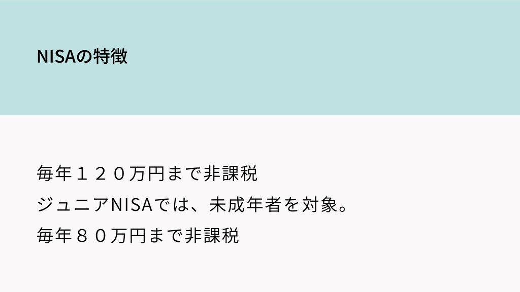 NISAの特徴 毎年120万円まで⾮課税 ジュニアNISAでは、未成年者を対象。 毎年80万円まで⾮課税