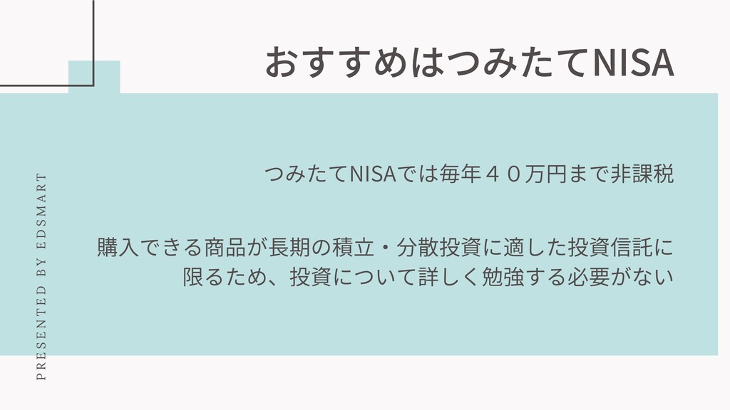 おすすめはつみたてNISA 購⼊できる商品が⻑期の積⽴・分散投資に適した投資信託に 限るため、投資について詳しく勉強する必要がない つみたてNISAでは毎年40万円まで⾮課税 P R E S E N
