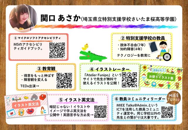 教育観 ・得意をもっと伸ばす ・障害観を変える TEDx出演→ 『Atelier Funipo』という サイトで先生が無料で 使えるイラストを公開! ⑤ イラスト英文法 暗記じゃない!イラストや イメージで学ぶ英文法を 公開中!英語苦手な方必見→ ⑥ 教員コミュニティリーダー MIEE Talks@Admin.という ICTを活用した教員コミュニ ティ運営中。同じ学校以外の 先生との繋がりは大事です。 ④ イラストレーター ② 特別支援学校の教員