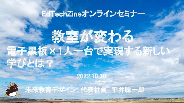 2022.10.30 未来教育デザイン 代表社員 平井聡一郎 EdTechZineオンラインセミナー 教室が変わる 電子黒板×1人一台で実現する新しい 学びとは?