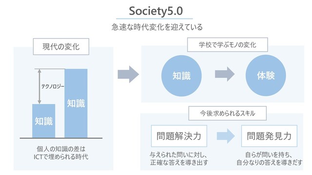 Society5.0 知識 知識 テクノロジー 急速な時代変化を迎えている 知識 体験 今後求められるスキル 現代の変化 与えられた問いに対し、