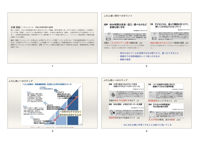 ࣌ͷڭҭֶձཧࣄɺຊڭ ҭֶڠձཧࣄɻจ෦ՊֶলʮσδλϧڭՊॻͷޮՌɾӨڹʹؔ͢Δ࣮ূݚڀࣄۀʯ༗ࣝऀձٞҕһɻઐڭҭ ֶɺڭҭϝσΟΞֶɺίϯϐϡʔλར༻ڭҭֶɺڭՊڭҭֶɺ૯߹తֶशڭҭֶͳͲɻ मʰใϦςϥγʔܒൃͷͨΊͷཏ൫ʱ ʢϥοΫʣ ɺ ʰใϦςϥγʔܒൃͷͨΊͷཏ൫ɹใ׆༻ฤʱ ʢϥοΫʣ ɻ ஶॻʰ*$5 ΛͬͯΈΑ͏ʂʵࠓٻΊΒΕ͍ͯΔֶྗΛʹ͚Δखஈͱͯ͠ʱ ʢେຊਤॻʣ ɺ ʰجૅ͔ΒֶͿύιί ϯʵ͘͠Έ͔Βσʔλղੳ·Ͱʵʱ ʢڞཱग़൛ʣ ɺ ʰσδλϧڭࡐͰཧՊ͕มΘΔʵतۀͮ͘Γࣄྫूʵʱ ʢ͗ΐ͏͍ͤʣ ΄͔ɻ খྛ༞لʢ͜͠Ώ͏͖ʣ ɹҵେֶڭҭֶ෦।ڭत ത࢜ʢֶज़ʣ ɻެཱখֶߍڭ་Λܦͯ ݄ΑΓݱ৬ɻઐڭҭֶɺ*$5 Λ׆༻࣮ͨ͠ફݚڀɻຊڭҭϝ σΟΞֶձʢཧࣄʣ ɺຊσδλϧڭՊॻֶձʢཧࣄʣ ɺ"* ࣌ͷڭҭֶձʢཧࣄʣ ɻจ෦Պֶল*$5 ׆༻ڭҭΞυόΠ βʔɺจ෦Պֶলҕୗࣄۀʮֶशऀ༻σδλϧڭՊॻͷΫϥυ৴ʹؔ͢ΔϑΟʔδϏϦςΟݕূࣄۀʯ༗ࣝऀձٞ ʢҕһʣͳͲΛྺɻ ฤஶɾमʰίϯϐϡʔλʔΛΘͳ͍খֶߍϓϩάϥϛϯάڭҭl ϧϏΟͷ΅͏͚Μ z ͰҭΉཧతࢥߟʱ ʰ͜ΕͰେ ৎʂখֶߍϓϩάϥϛϯάͷतۀ ʴЋͷतۀύλʔϯΛҙࣝ͢Δʦतۀ࣮ફ ʧ ʱ ʰখֶߍϓϩάϥϛϯάڭҭͷ ݚमΨΠυϒοΫʱ ʢ͍ͣΕᠳӭࣾʣ ɺࣥචʰλϒϨοτΛतۀʹ׆͔͢/),GPS4DIPPMɹ࣮ફࣄྫ ʱ ʢ/), ग़൛ʣ΄͔ɻ ˙ 1BSUɹΤϐιʔυฤɹࣥච ळݩେี ધڮࢢཱᷤ০খֶߍɹߍ ൧ా३Ұ ۚࢢཱຊখֶߍɹڭ་ Ҫ্࢙ ඣ࿏ࢢཱ๛খதֶߍɹڭ಄ Ҫ্Ղঘ ඣ࿏ࢢཱ๛খதֶߍɹڭ་ ӓҪӳ ಹՑࢢڭҭҕһձɹ෭ࢀࣄ݉ࢦಋࣨ ా ͭ͘ࢢཱޗ࠺খֶߍɹڭ་ Ԭాܙඒ Ճࢢཱொখֶߍɹڭ་ খ߁ฏ ͭ͘ࢢཱޗ࠺খֶߍɹڭ་ දٱඒࢠ খদࢢڭҭݚڀηϯλʔɹॴ זࡔߒً ඣ࿏ࢢཱ๛খதֶߍɹڭ་ ཅࢠ ۚࢢཱখֶߍɹڭ಄ ࠇӋྒ ಹՑࢢཱ๕খֶߍɹڭ་ ܊࢘ ւಓڭҭେֶෟଐവؗதֶߍɹڭ་ ࡖতത খࠃொཱখࠃখֶߍɹߍ ᓎҪݩଠ ۚࢢཱेҰখֶߍɹڭ་ ࠤ߳ಸ ͭ͘ࢢཱޗ࠺খֶߍɹڭ་ ࠤ՚ࢬ খদࢢཱদ౦ΈͲΓֶԂɹڭ་ ࠤ৳໌ ദࢢཱखլ౦খֶߍɹߍ ࢛ํߤฏ ͭ͘ࢢཱޗ࠺খֶߍɹڭ་ ന㚁 ਸ਼थ ּؒࢢּཱؒதֶߍɹڭ་ ৽୩ढ़྄ ྠౡࢢཱொখֶߍɹڭ་ ∁দ߶ ਫށࢢڭҭҕһձɹࢦಋओࣄ ཱੴتඒࢠ ֶߍ๏ਓֶӃֶӃখֶߍɹڭ་ ాத༃ߒ ٢ࢢཱՏখֶߍɹڭ་ ۄ༏ే ٱتࢢཱଠాখֶߍɹڭ་ Լ උલࢢཱ߳ొখֶߍɹڭ་ ࣌݉लॆ चऱࢢٰཱதֶߍɹߍ த༸ࢠ খদࢢڭҭҕһձɹࢦಋओࣄ தఉҰढ़ ಹՑࢢڭҭҕһձɹࢦಋओࣄ Ӭ ٱتࢢཱଠాখֶߍɹڭ་ Ӭ٢༐ ೳඒࢢཱؾখֶߍɹڭ་ ే ٱتࢢཱଠాখֶߍɹڭ་ ڮຊॱಙ ҵࢢཱฏׁখֶߍɹڭ་ ౦ਗ਼ਔ ԣࢢཱখֶߍɹओװڭ་ Ұ࠸ ُԬࢢΈΒ͍ڭҭϦαʔνηϯλʔɹࢦಋओࣄ ʢ࣮ફ࣌ɿُԬࢢཱ౦ผӃখֶߍڭ་ʣ ߂ҁ೫ ͭ͘ࢢཱޗ࠺খֶߍɹڭ་ ኍాܙࢠ খদࢢཱদ౦ΈͲΓֶԂɹߍ ాߊ ۚେֶෟଐখֶߍɹڭ་ ౻ా࢜ ҵݝཱڠಛผࢧԉֶߍɹڭ་ ඌঘࢤ ژࢢཱീখֶߍɹߍ ᣕՙ୩ҥཬಸ খদࢢཱූখֶߍɹڭ་ ҆Ҫथ ࡳຈࢢཱຈখֶߍɹڭ་ ༄ڮѯ ͭ͘ࢢཱޗ࠺খֶߍɹڭ་ ࢁதতַ ֶߍ๏ਓࠤ౻ӫֶԂ͞ͱֶ͑Ԃখֶߍɹڭ་ ࢁຊ७ ٱتࢢڭҭҕһձɹࢦಋओࣄ ٢७ฏ ͭ͘ࢢཱޗ࠺খֶߍɹڭ་ GIGA_3rd.indd 141 22/01/17 20:37 1 ࣇಐʹʮͲ͏ͩΖ͏ʁʯͱ͏ڭࢣͷ࢟ɹQ ʮ͜ͷΞϓϦΛ͍͍͔ͬͯͲ͏͔ʯͱ͍͏Ϩϕϧͷ࣭ Λ٫͠ɺࣗͳΓʹతΛ࣋ͬͯΛ׆༻ͯ͠ʜ ࣗ༝ʹΘͤͯΈΑ͏ͱ͍͏ڭࢣͷ࢟ɹQ ͦͷΑ͏ͳ׆༻ͷதͰɺͪΖΜτϥϒϧى͖͍ͯͬ ͨɻʜ w ԿͷͨΊʹπʔϧΛ׆༻͢Δͷ͔͏ͨΓɺޠͬͨΓ͢Δ͜ͱ w तۀ֎Ͱͷ׆༻໘Λ͍ͭ͘ݟ͍ͩͤΔ͔ w ڭࢣͷ֮ޛ ;ͩΜ͍ҠߦͷϙΠϯτ 2 َ1য1ഈଜ؞ৈசৢਦ୭ُ॑ણऊखञ৾लभઍॖওش४ 岲峚... 嵣৶ఐ峘౸峑岝௴嵣ৰୡ峘 峕岝୶峑岝ஷ峴ନ峴峮 峲峴岷峫岵峔ীෲ岶૭ચ岞 嵣ভ峘౸峑岝ঽ峑ઽૐ峁 峉ر峔崯嵤崧峮ੲਾ峼 PC峑峗়峹峅峐岹ীෲ岞 崡崮崫崿ڭ n峃岺峕峑峬||峓峘ઇఐ峑峬| nၴ峑峬|ણ岵峅峵ڭযڭഈଜ 崡崮崫崿ڮ ઇఐ峘৾峝峼峫峵岞 ઇఐ峘৾峝峘মସ峕峵岞 崡崮崫崿گ ઇఐ峘৾峝峼峎峔岺岞 ভୖಉ峘ੰৠ峮 যয峘ต峘ৰਠ峕ણ岵峃岞 岲峚... 嵣ਫ਼ด崝崌崰峼৷岮峐岝౸崮嵤嵆峕ૢ峂峐 যয岶ر峔ધฆ峮峼ઽૐ峁岝 ੲਾ峘ઌᑌ峼ਖ਼峁岝ତ৶峃峵岞 嵣যয岶ધฆਛ崥崽崰峼ણ৷峁岝 ᤓ峼峗峐শધ峘嵔嵅嵤崰峼ਛ峃峵岞 ੵઃਸ਼峑岝 ৾峝峘૭ચਙ峙૮প峕岞 15 ʮ(*("εΫʔϧߏʯʹ͍ͭͯɼจ෦Պֶলʢʣɺҹٴͼബԫ৭ͷ࢛֯෦චऀՃච ;ͩΜ͍ͷεςοϓ ҰํͷͷͰͳ͘ ํΛࢤ͢Δͷ 3 ;ͩΜ͍ͷεςοϓ ࣇಐͷॳΊͯΛࢧԉ͢ΔखཱͯɹQ ૬ޓ࡞༻Λੜ͔͢Έͮ͘ΓɹQ େਓͷෆ҆ͷղফɺྑ͞ͷ࣮ײɹQ ڭҭҕһձͱͯ͠Ͱ͖Δ͜ͱɹQ w ͡ΊΛେࣄʹखް͘͢Δ͜ͱޙʑʹޮ͍ͯ͘Δ 4