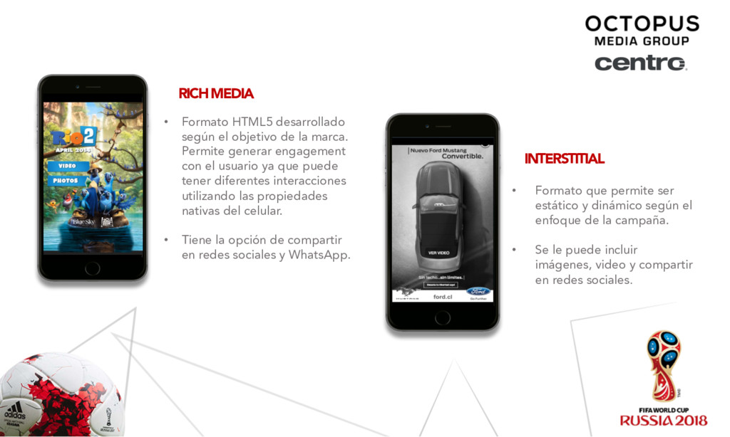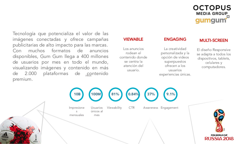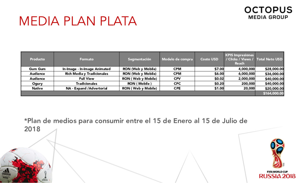 15 de Enero al 15 de Julio de 2018 Producto Formato Segmentación Modelo de compra Costo USD KPIS Impresiones / Clicks / Views / Reach Total Neto USD Gum Gum In-Image - In-Image Animated RON (Web y Mobile) CPM $7.00 10,000,000 $70,000.00 Audience Rich Media y Tradicionales RON (Web y Mobile) CPM $6.00 14,000,000 $84,000.00 Audience Full View RON ( Web y Mobile) CPV $0.02 5,000,000 $100,000.00 Ogury Tradicionales RON ( Mobile ) CPC $0.20 350,000 $70,000.00 Native NA - Expand /Advertorial RON ( Web y Mobile) CPE $1.00 40,000 $40,000.00 $364,000.00