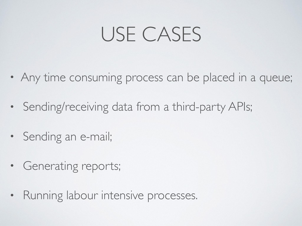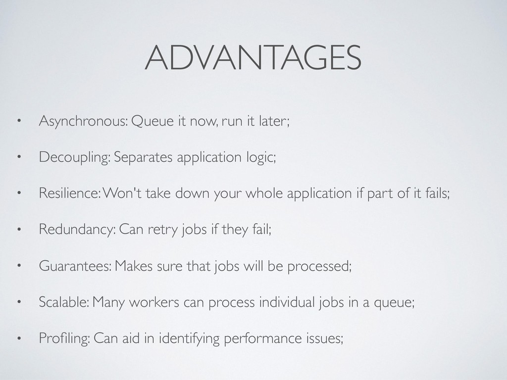 Decoupling: Separates application logic; • Resilience: Won't take down your whole application if part of it fails; • Redundancy: Can retry jobs if they fail; • Guarantees: Makes sure that jobs will be processed; • Scalable: Many workers can process individual jobs in a queue; • Profiling: Can aid in identifying performance issues;
