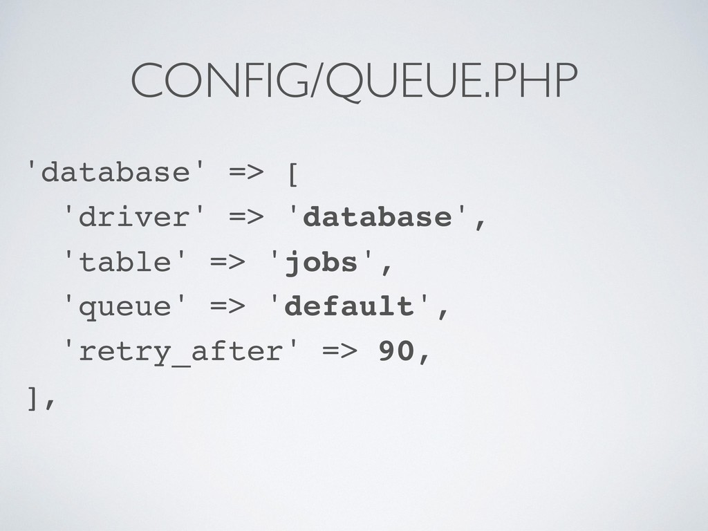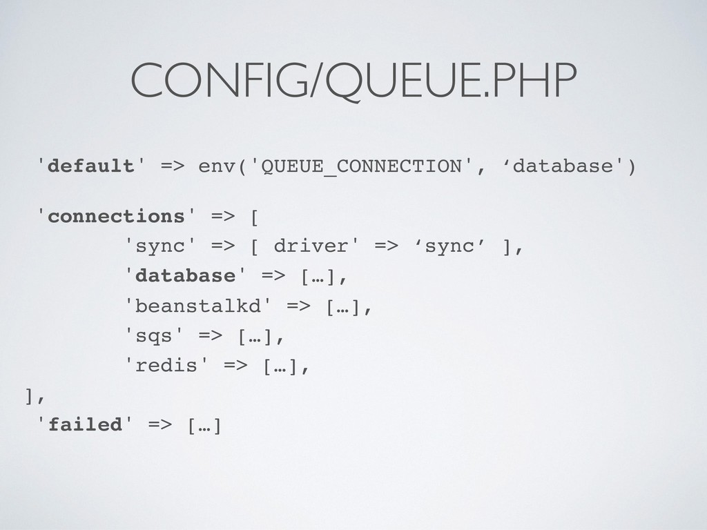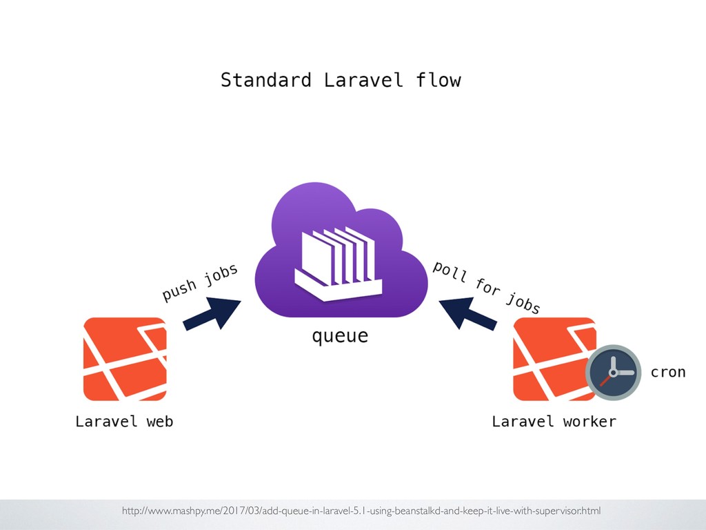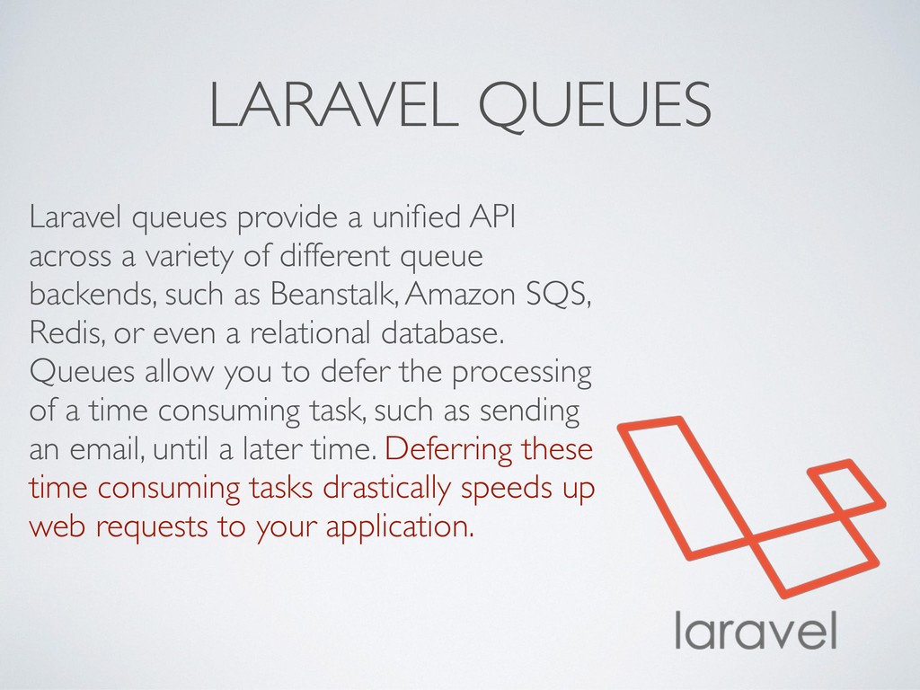 variety of different queue backends, such as Beanstalk, Amazon SQS, Redis, or even a relational database. Queues allow you to defer the processing of a time consuming task, such as sending an email, until a later time. Deferring these time consuming tasks drastically speeds up web requests to your application.