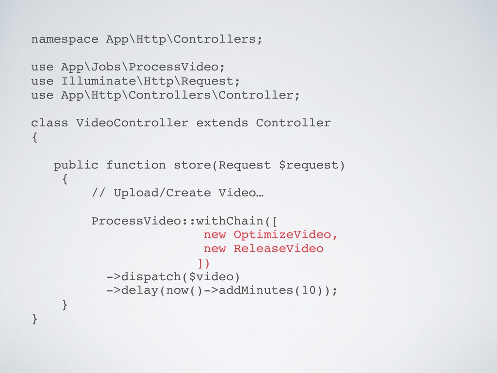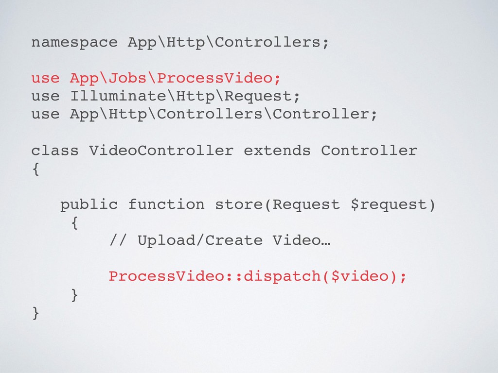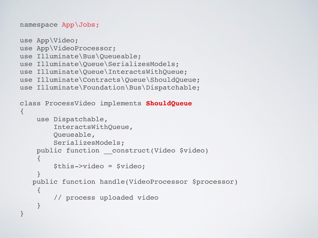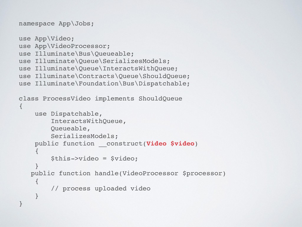 use Illuminate\Queue\InteractsWithQueue; use Illuminate\Contracts\Queue\ShouldQueue; use Illuminate\Foundation\Bus\Dispatchable; class ProcessVideo implements ShouldQueue { use Dispatchable, InteractsWithQueue, Queueable, SerializesModels; public function __construct(Video $video) { $this->video = $video; } public function handle(VideoProcessor $processor) { // process uploaded video } }