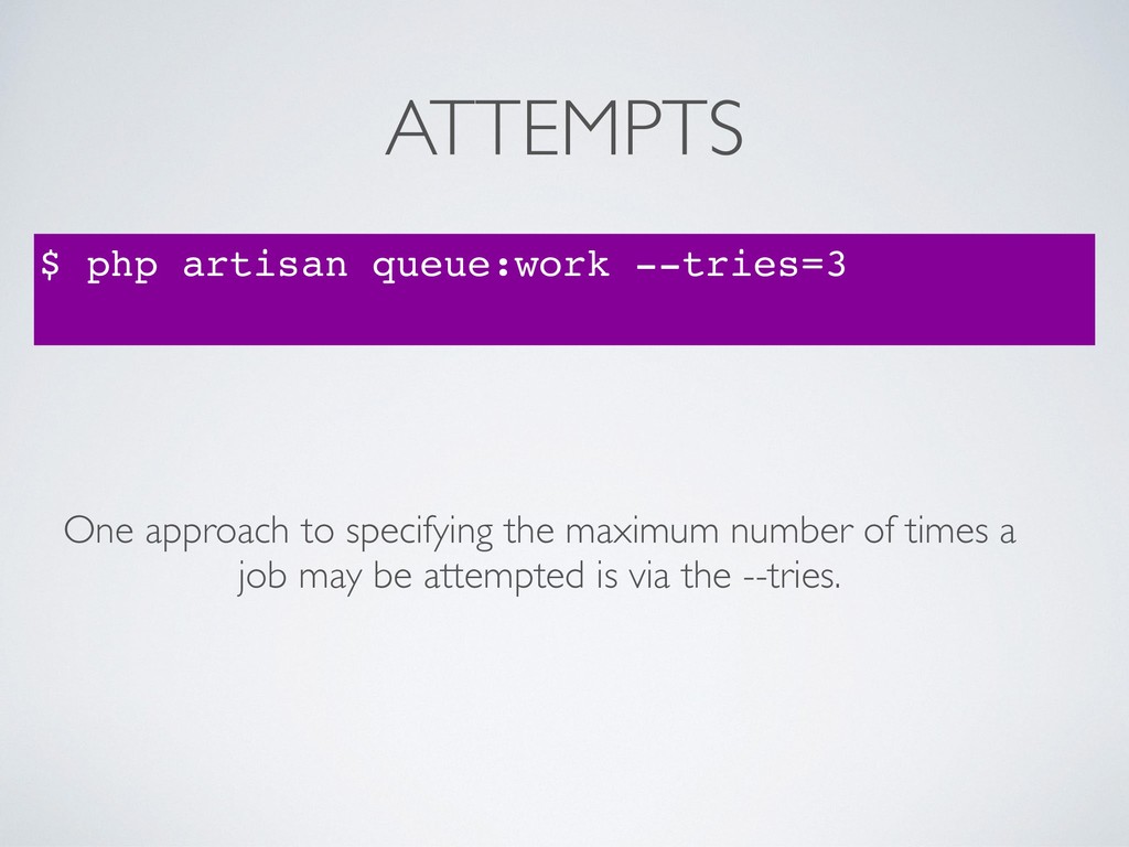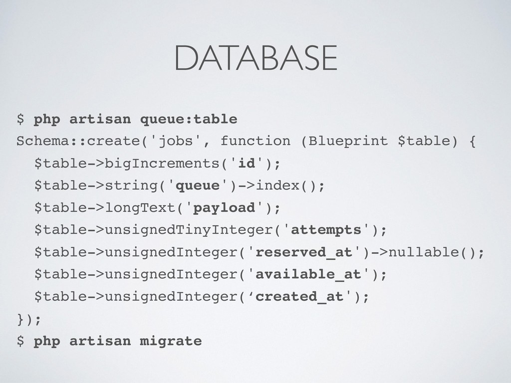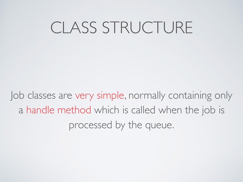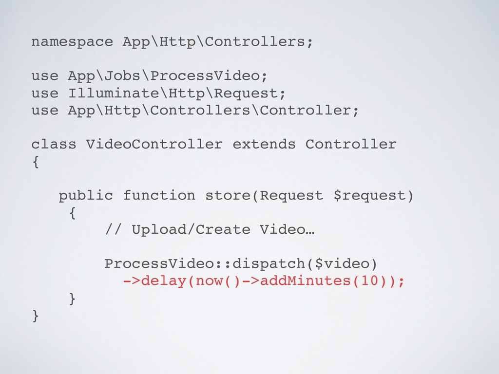 use Illuminate\Queue\InteractsWithQueue; use Illuminate\Contracts\Queue\ShouldQueue; use Illuminate\Foundation\Bus\Dispatchable; class ProcessVideo implements ShouldQueue { use Dispatchable, InteractsWithQueue, Queueable, SerializesModels; public function __construct(Video $video) { $this->video = $video; } public function handle(VideoProcessor $processor) { // process uploaded video } }