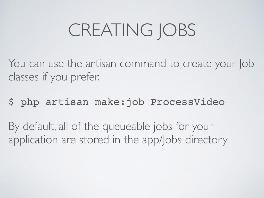 your Job classes if you prefer. $ php artisan make:job ProcessVideo By default, all of the queueable jobs for your application are stored in the app/Jobs directory